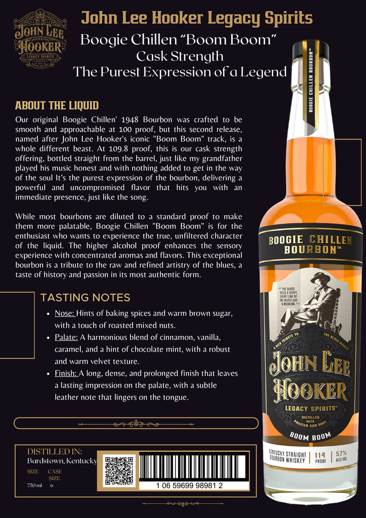 Our original Boogie Chillen' 1948 Bourbon was crafted to be smooth and approachable at 100 proof, but this release, named after John Lee Hooker's iconic "Boom Boom" track, is a whole different beast. At 109.8 proof, this is our cask strength offering, bottled straight from the barrel, just like my grandfather played his music honest and with nothing added to get in the way of the soul It’s the purest expression of the bourbon, delivering a powerful and uncompromised flavor that hits you with an immediate presence, just like the song. While most bourbons are diluted to a standard proof to make them more palatable, "Boom Boom" is for the enthusiast who wants to experience the true, unfiltered character of the liquid. The higher alcohol content enhances the sensory experience with concentrated aromas and flavors. This exceptional bourbon is a tribute to the raw and refined artistry of the blues, a taste of history and passion in its most authentic form. Tasting Notes Nose: Hints of baking spices and warm brown sugar, with a touch of roasted mixed nuts. Palate: A harmonious blend of cinnamon, vanilla, caramel, and a hint of chocolate mint, with a robust and warm texture. Finish: A long, dense, and prolonged finish that leaves a lasting impression on the palate, with a subtle leather note that lingers on the tongue. |